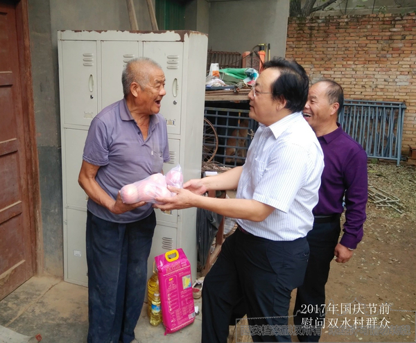 9月29日,在国庆和中秋双节来临之际,西安市档案馆(局)长崔林一行4人来到对口帮扶的蓝田县孟村镇双水村走访慰问13户贫困户,给他们送去了大米和食用油等节日慰问品,提前祝他们“双节”快乐,让贫困群众感受到党和政府的关怀与温暖,从而进一步坚定脱贫的信心与决心,激发内生动力,致富奔小康。