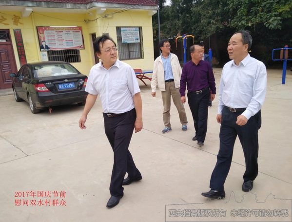 西安市档案馆(局)长崔林(左一)、副馆(局)长吴立民(右一)和双水村的同志查看双水村村容村貌