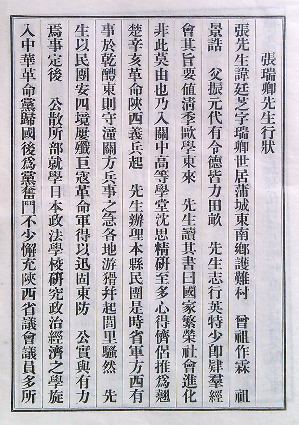 2017年1月,西安市档案馆从本市市民杨城虎先生处征得《张瑞卿生平事略》(本书无书名,作者拟)一书。《蒲城县志》载:张廷芝(1885~1929),字瑞卿,椿林乡护难村人。早年留学日本,加入中华革命党。回国后,被选为陕西省议会议员。陕西靖国军时,任总司令部谘议及第三路曹世英部参谋,兼代高陵县知事。民国8年(1919),北洋政府在上海召开南北和平会议,他代表靖国军出席、后任杨虎城军主任参谋。