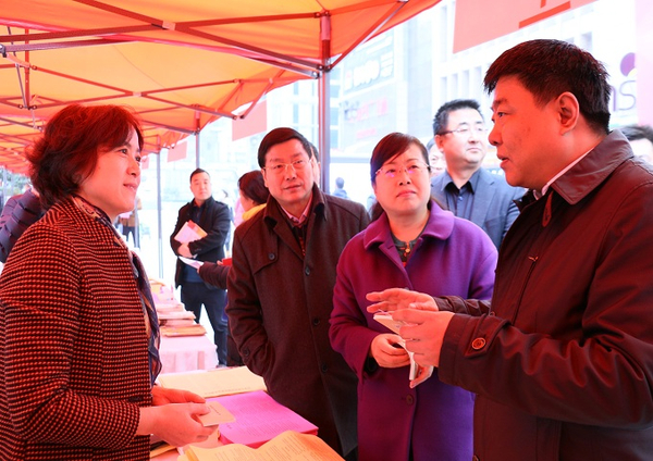 西安市档案局副局长黄海绒(左一)向群众发放档案法制宣传材料