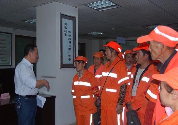 市档案馆保管利用处处长向环卫工人介绍查档流程和方法
