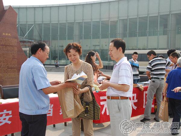 市档案局副局长黄海绒(左二)、未央区档案局局长王海鸿(左三)向群众发放宣传资料