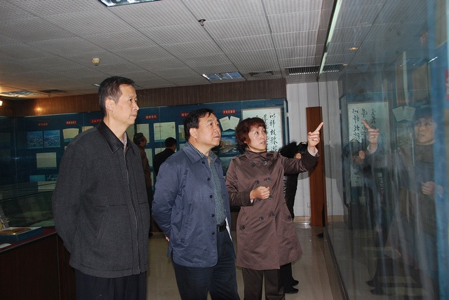 省档案局局长王建领(中)观看《西安市档案馆馆藏珍品陈列展》