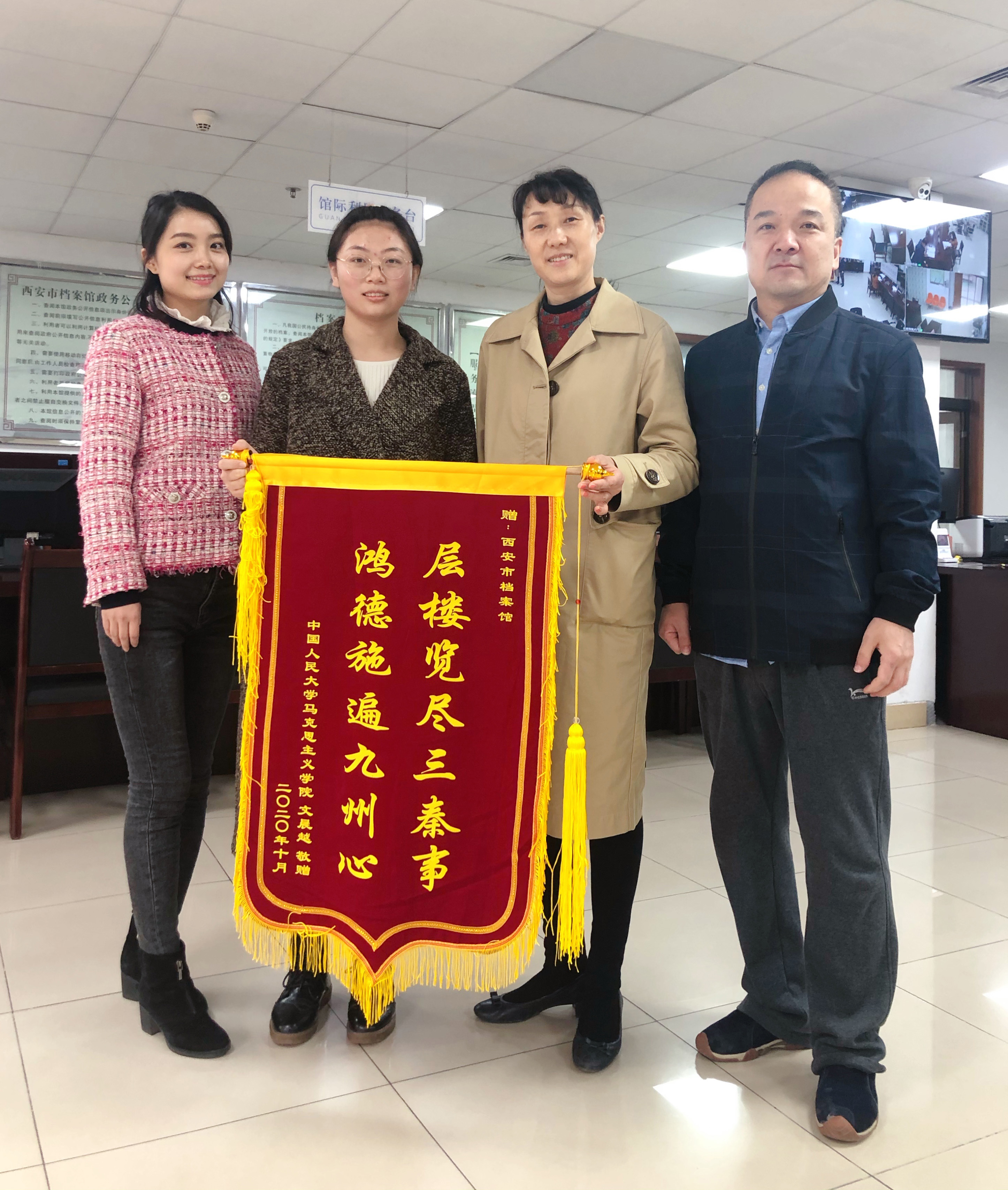 2020年10月20日,中国人民大学马克思主义学院硕士研究生文晨越来到我馆,将一面写有“层楼览尽三秦事,鸿德施遍九州心”的锦旗送与我馆,感谢我馆工作人员的暖心服务。