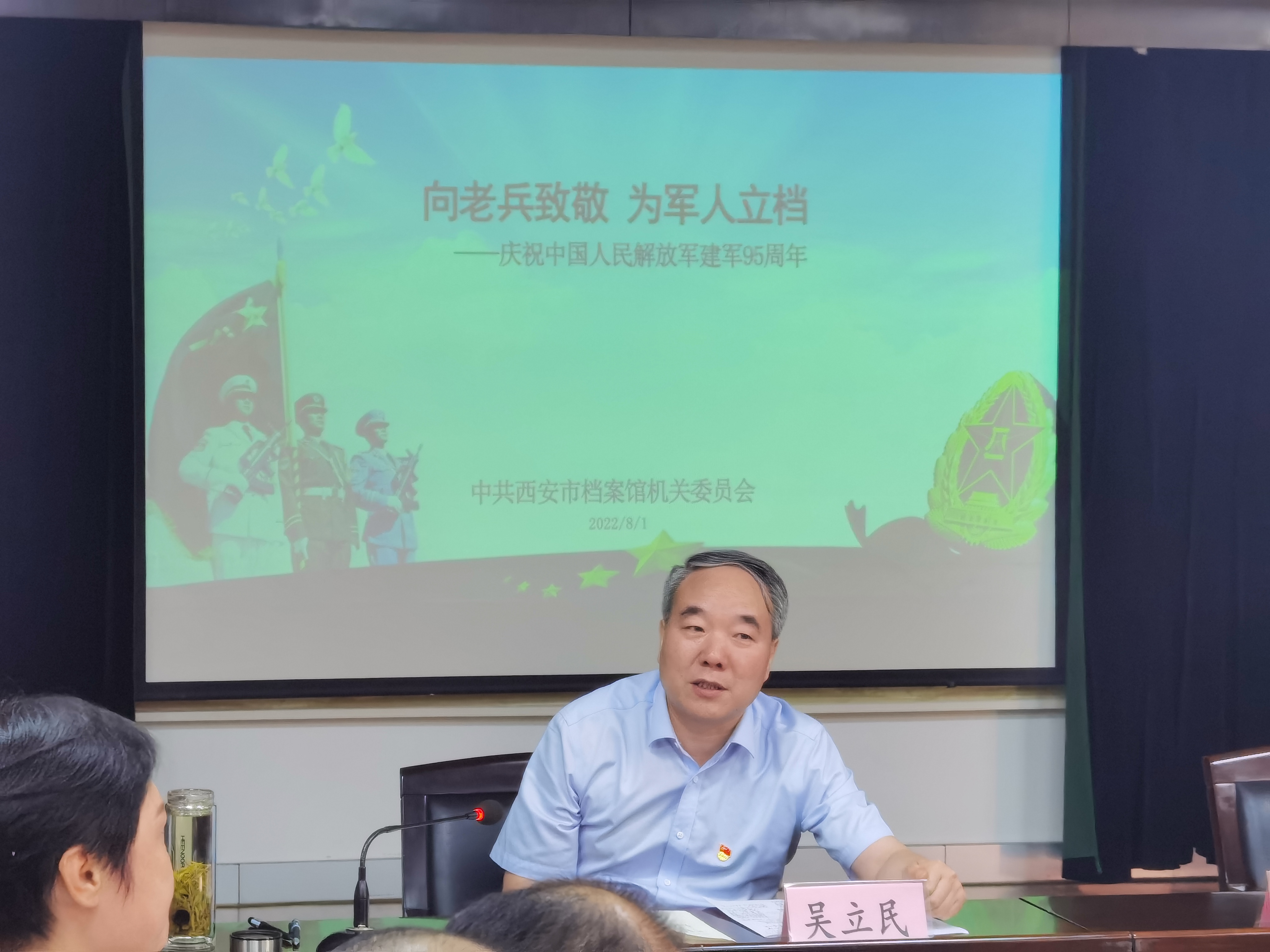 “英雄不独疆场出,闪光尽在细微处;投身军营热血颂,奉献兰台终不悔”。为庆祝中国人民解放军成立95周年,继承和发扬军人优良的思想、工作作风,进一步激发党员干部开拓进取、担当作为的强大力量,努力打造团结、积极、向上的档案团队,8月1日,西安市档案馆开展了“老兵新档”主题党日活动。市档案馆馆长、市委办公厅副主任吴立民出席活动并讲话,副馆长黄海绒主持,馆全体党员参加。