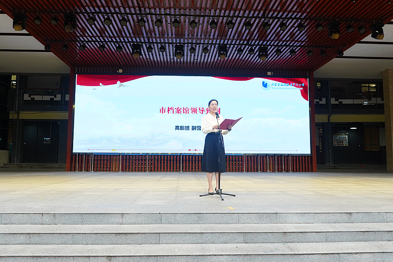 在后宰门小学“小水滴”舞蹈团孩子们轻盈而充满希望的舞蹈《我是未来》中,活动拉开序幕。西安市档案馆副馆长高粉娥在致辞中介绍,活动中展示的这面国旗,是2009年5月20日,也就是西安解放60周年纪念日当天,在首都北京天安门广场升起的国旗。今年5月20日,市委隆重举行西安市迎接天安门广场国旗暨庆祝西安解放75周年活动,并将这面特殊的国旗交由市档案馆入档珍藏。她指出,举办这次主题实践活动的目的,一是为同学们带来一堂别开生面的思想政治课。将馆藏红色档案资源转化为学校“扣好人生第一粒扣子”大思政课建设的生动教材。二是让同学们参加一次具有特殊意义的展旗、升旗仪式,感受国之风采、旗之威严,激发爱国心、强国志。三是为进一步凸显档案工作的社会价值开拓思路,盘活档案资源,不断创新爱国主义教育的机制与形式。