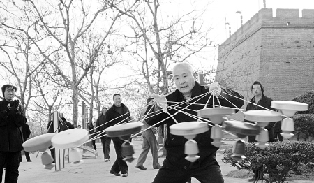 77岁的任振远师傅操纵16根绳子同时舞动8只空竹,身体、空竹、绳子相互协调,尽显难度