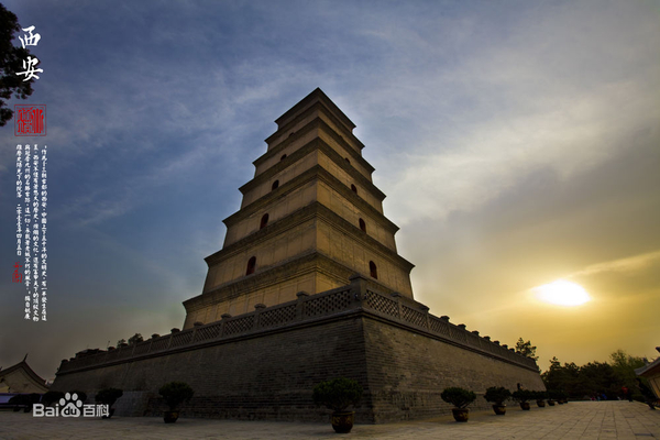 大雁塔(Great Wild Goose Pagoda),世界文化遗产、全国重点文物保护单位、国家AAAAA级旅游景区。位于西安市的大慈恩寺内,被视为古都西安和陕西省的象征。唐代永徽三年(公元652年),取经归来的玄奘法师为保存由天竺经丝绸之路带回长安的经卷佛像而修建。大雁塔作为现存最早、规模最大的唐代四方楼阁式砖塔,是佛塔这种印度佛寺的建筑形式随着佛教传播而传入中原地区并融入汉文化的典型物证,是凝聚了汉族劳动人民智慧结晶的标志性建筑,现存塔身七层,通高64.5米。
