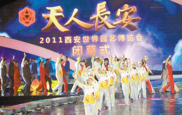 天人长安铸就和谐梦想,创意自然开启绿色未来。2011年10月22日晚,历时178天的2011西安世界园艺博览会,在西安浐灞正式落下帷幕。中共陕西省委书记、省人大常委会主任赵乐际出席闭幕式并宣布闭幕。陕西省省长、西安世园会组委会主席赵正永,世界园艺生产者协会主席杜克·法博分别致辞。闭幕式由中共陕西省委常委、西安市委书记、西安世园会执委会主任XXX主持。于4月28日开园的2011西安世界园艺博览会,吸引了52个国家和地区、58个国内城市与企事业单位的积极参与,展示了各具特色、丰富多彩的园艺、建筑、科技、文化活动,接待超过1572万名中外游客的热情参观,引领了一场绿色、环保、低碳的生活时尚。 图为闭幕式盛况。