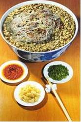 牛羊肉泡馍的特点是料重味重,肉烂汤浓,香气诱人,食后余味无穷,又有暖胃之功能。牛羊肉泡馍是西安最有特色最有影响的食品。古称“羊羹”,宋代苏轼有“陇馔有熊腊,秦烹唯羊羹”的诗句。羊肉泡馍的烹饪技术要求很严,煮肉的工艺也特别讲究。其制作方法是:先将优质的牛羊肉洗切干净,煮时加葱、姜、花椒、八角、茴香、桂皮等佐料煮烂,汤汁备用。馍,是一种白面烤饼,吃时将其掰碎成黄豆般大小放入碗内,然后交厨师在碗里放一定量的熟肉、原汤,并配以丛末、白菜丝、料酒、粉丝、盐、味精等调料,单勺制作而成。牛羊肉泡馍的吃法也很独特,有羊肉烩汤,即顾客自吃自泡:也有干泡的,即将汤汁完全渗入馍内。吃完馍、肉,碗里的汤也被喝完了。还有一种吃法叫“水围城”,即宽汤大煮,把煮熟的馍、肉放在碗中心,四周围以汤汁。这样清汤味鲜,肉烂且香,馍韧入味。如果再佐以辣酱、糖蒜,别有一番风味。是一种难得的高级滋补佳品。西安的羊肉泡馍馆很多,其中老字号有“老孙家”、“同盛祥”等较有名气。