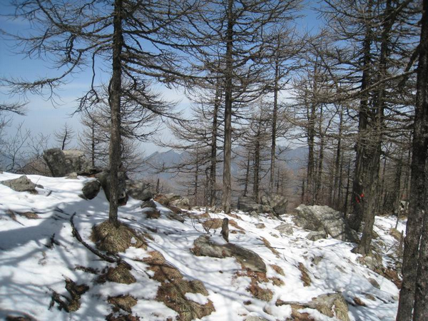 越往上走,山路越陡,气温也明显低了很多,石块铺就的山路结了一层厚厚的冰,滑得无法行走,我们从旁边的雪地向上登,厚厚的雪覆盖了山坡,也不知下面是石是土,深一脚浅一脚往上爬就是。眼前全然一派冬日的景象,没有一丝绿色,这里分布着大片的太白红杉,其分布高度在海拔3200~3400米,属于国家二级保护植物。