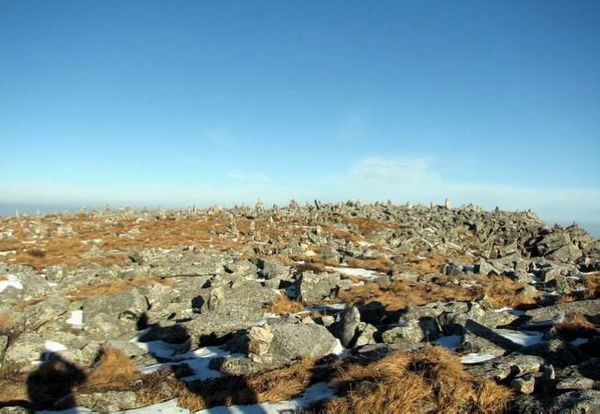 站在如此高的山巅,人会有一种错觉,仿佛身处雪域高原,眼前尽是被白雪覆盖的高山,山体苍劲有力,没有丝毫圆润的曲线,太阳很近,阳光从头顶火辣辣地照下来,风没有了遮拦,起劲儿地吹着。远处,在白雪的下面,一块块巨大的岩石从少太白的山顶倾泻而下,仿佛一片岩石的海洋,石海把山腰的红杉林撕扯出一道道的裂痕,宛如一条条石河。太白山最著名的石海在跑马梁,跑马梁虽在太白山顶的脊峰线上,但却平坦而宽阔,然而它并不能“跑马”,而是由岩石的冻融作用崩解形成的巨石海洋。