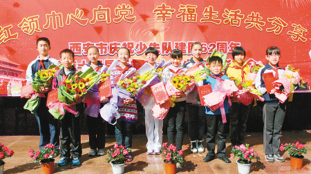 2011年10月13日是少先队建队62周年纪念日。13日下午,我市在吉祥路小学举行第十五届“西安市十佳少年”、“西安市优秀少先队员”表彰大会,我市师生代表1200余人参加了盛会。“西安市十佳少年”、“西安市优秀少先队员”是我市广大少先队员的崇高荣誉,由共青团西安市委、西安市教育局、西安市少工委、西安日报社共同授予。王仕鹏、刘宇航、李雨璇、朱雯洁、张云雁、何明轩、张雅乔、昌艾咪丽、侯启昕、谢睿迪等10名少年获得“第十五届西安市十佳少年”荣誉称号,101名少年获得“西安市优秀少先队员”称号。活动现场还举行了庄严的新队员入队仪式,为我市少先队组织注入了新生力量。据悉,建队日期间,全市共有200多所学校举行了新队员入队仪式。图为受到表彰的“西安市十佳少年”。