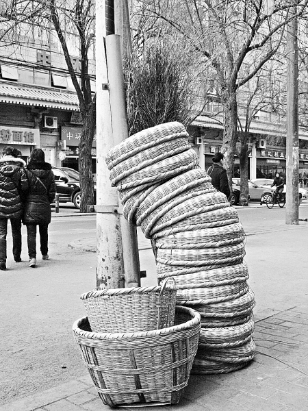 郭师傅并不是本地人,而是从河南来到西安的,我问他编竹器编了多少年?他说:“少说也有二十年了,在我们老家河南,遍地都是竹子。”郭师傅并不是竹笆市的店家或住户,他只是偶尔来这里,靠编竹器挣点钱。他戏称自己只是给老板打工的,有了生意才来竹笆市,这家店的店主也是河南人,是他的亲戚。郭师傅用纯正的河南方言跟记者说:“今天你能碰到我在这儿真是巧,我很少来,这条街上,已经没有会编竹筐了。”
