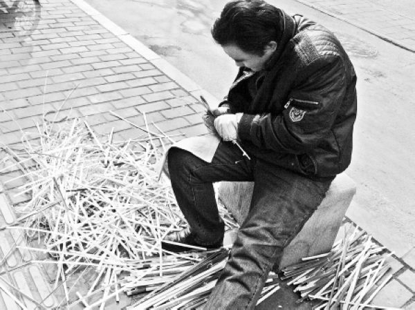难道,今天的竹笆市,真的就没有制作竹器的手艺人了吗?过了几天,记者再次来到了竹笆市,只为能找到会制作竹器的老手艺人。也是巧合,刚走过马坊门和竹笆市的丁字路口,记者便看见一位正在编竹筐的老手艺人,坐在街边一家小店铺的门前。他正编着一个直径约半米的大竹筐,只见他熟练地将竹篾子盘绕交叠,粗糙坚硬的竹签在他的手中仿佛有了生命,变得灵动而欢快。只是他的双手在冬日的寒风中冻得又红又肿,粗糙不堪。