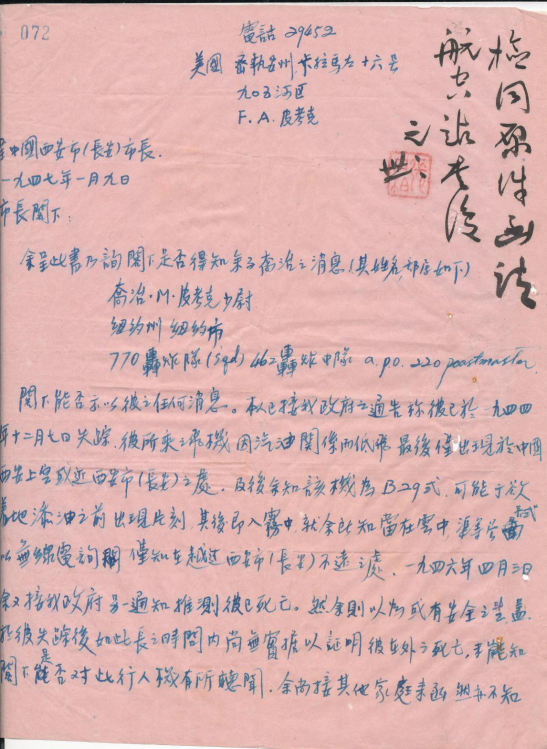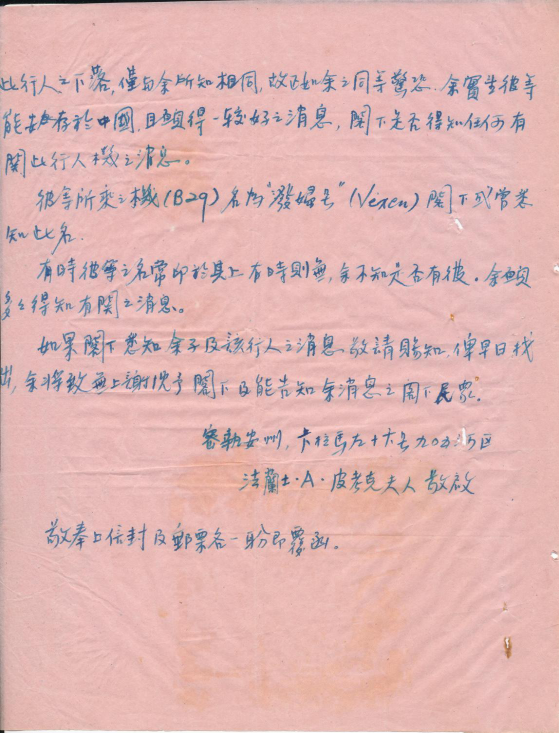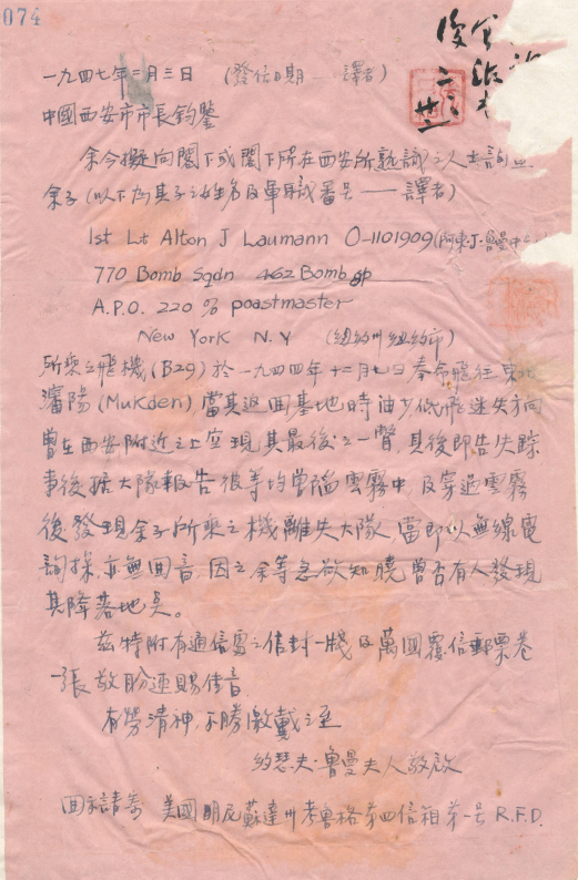 在西安市档案馆至今保存着两封60多年前寄自美国的来信,这是两位美国母亲分别寄给当时的西安市市长,请求帮助寻找因参加对日作战任务而在华失踪的飞行员儿子的信笺。信笺用蓝黑墨水书写于粉色信纸之上,已翻译成中文(目前尚不知是信笺从美国发出时即已译为中文,还是收到信件后国内有关人员所翻译)。两封信原文如下: