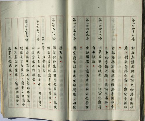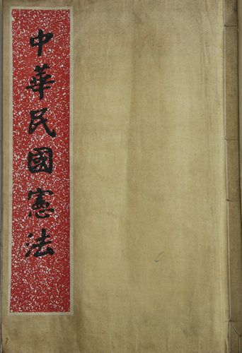 这件《中华民国宪法》为民国36年(1947年)8月商务印书馆出版的正本影印版。封面以黄锦包装,左侧贴红色银粉纸,印以毛笔书写的《中华民国宪法》书名。全本前半部分为宪法条文,后半部分为参加国民大会的委员签名。这部影印版《中华民国宪法》印刷清晰逼真,保存完好,具有一定的文物史料价值。