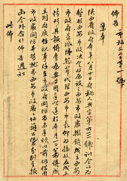 民国三十三年(1944)9月2日西安市政府成立的布告