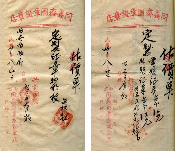 这组档案为陕西省政府关于成立西安市政府并派陆翰芹为代理市长的训令、市政府成立的布告底稿、在同义斋图章证章店定制市政府证章的作价单。