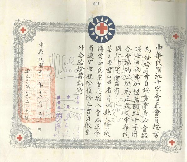 民国三十年(1941)12月中华民国红十字会颁发给会员蔡文忠的正会员证书