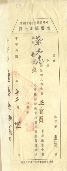 《中华民国红十字会总会会费临时收据》(见图二),上面写有“临字第0013382号”,“介绍蔡文忠先生加入本会为正会员会员缴来会费国币拾元整除发给徽章证书外特给收据为凭”,该收据的时间是民国三十年十二月。