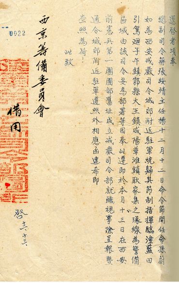 保存在民国档案西京筹备委员会全宗中《西安戒严司令部为任命孙蔚如为西安戒严司令致西京筹备委员会的公函》,内容载明:“顷奉总、副司令蒋张,绥靖主任杨十二月十二日命令,节开:任命孙蔚如为西安戒严司令,城郊附近驻军统归其节制指挥”。公函成文日期为民国25年(1936年)12月13日,此时,作为“西北剿匪总司令”的蒋介石已然被扣押,而公函仍以其名义宣布戒严,其中深意,可见一斑。
