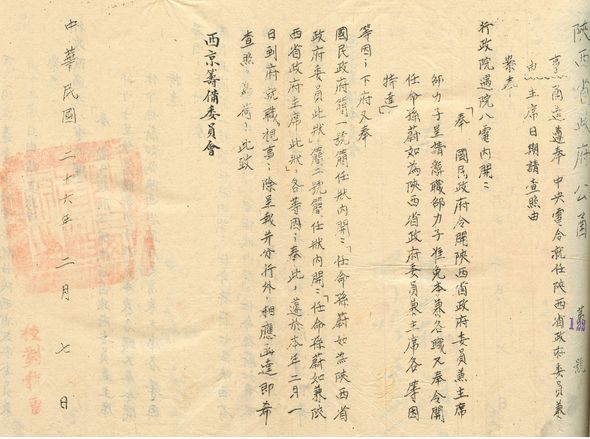《陕西省政府为任命孙蔚如为陕西省政府委员兼主席致西京筹备委员会的公函》,公函成文日期为民国26年(1937年)2月7日,内容载明:奉“行政院遇院八电”和“国民政府简一号简任状”、“简二号简任状”,任命孙蔚如为陕西省政府委员兼主席,孙已“遵于本年二月一日到府就职视事”。