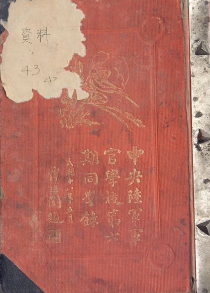 《中央陆军军官学校第六期同学录》,长27.3厘米,宽19厘米,为1929年印制,封面、封底用橘黄色漆布硬皮包装,封面以烫金压印“中央陆军军官学校第六期同学录 民国十八年五月 谭延闿题 ”25个大字