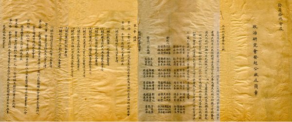 馆藏民国元年(1912年)《政治研究会发起公启及简章》一份,档案长 厘米,宽 厘米,内容分为“政治研究会发起公启”和“政治研究会简章”两部分。在“政治研究会发起公启”中指明成立政治研究会的原因是为了“养成国民之政治知识”,“于政府为诤友,于社会为导师”,并将发起人、赞成人名单附录在后。“政治研究会简章”共为七章三十五条款。第一章总纲,指明政团是“以研究政治之改良且促进其实行为目的,故定名曰政治研究会”,开列应研究事项十一条;其余各章分列入会资格手续、职员任务、会费、会议种类、罚则、附则等事项。