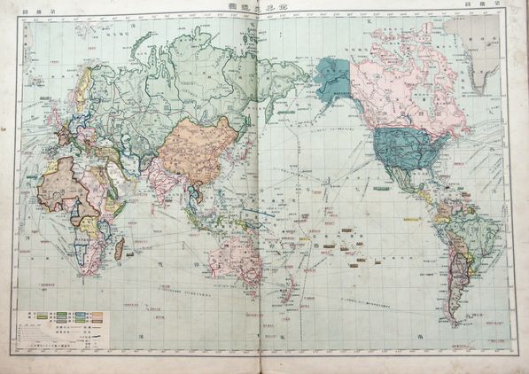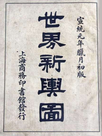 此件《世界新舆图》地图册为宣统元年(1909)腊月初版,上海商务印书馆发行,彩色印刷,长38.5厘米,宽28.5厘米,卷首《例言》载明本书“注重全球各国形势险要,专备研究外国地理之用,故名世界新舆图”,而且改变了旧版地图以本国首都子午线为起算经线的方法,使用国际通用的“公认英京伦敦格林威治天文台之子午线”。
