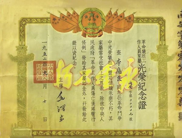 1952年1月10日,由毛泽东主席签发,中央人民政府向李应良烈士家属颁发的光荣纪念证